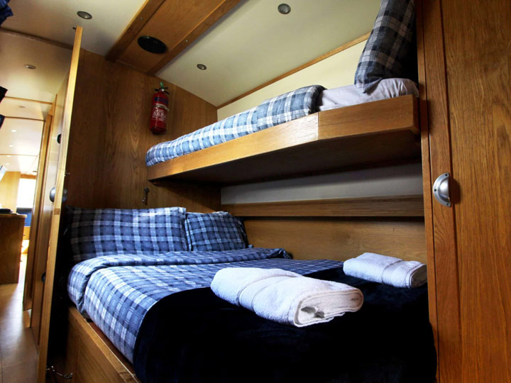Please note that the two mid cabins can either be configured as a double bed or two single beds with an optional bunk bed above the single bed suitable for children